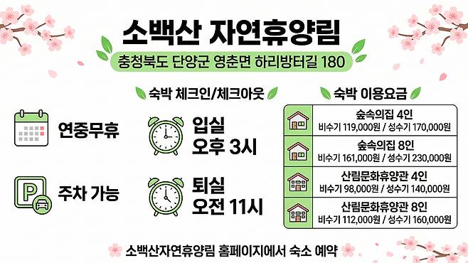 입실은 15:00, 퇴실은 11:00로 운영되며, 이용을 위해서는 사전 예약이 필요하다. 연중무휴로 운영되고 주차는 무료로 제공되기 때문에 접근성과 편의성 역시 뛰어난 편이다. 단양군 중심지에서 약 34분이면 도착할 수 있어 이동 부담도 크지 않다.