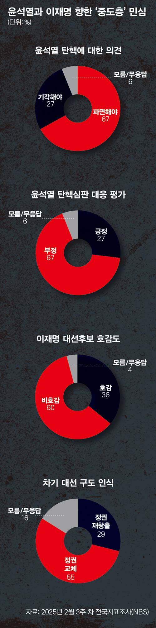 2월 3주 차 NBS 조사에서 중도층에 '윤 대통령 탄핵심판 대응'을 물은 결과, '부정평가'가 67%로, '긍정평가'(27%)를 2배 이상 웃돌았다. '헌법재판소 탄핵심판 과정 신뢰도' 조사에서 '신뢰함'이라고 답한 응답자가 65%로, '신뢰하지 않는다'(32%)고 답한 응답률을 크게 상회했다.