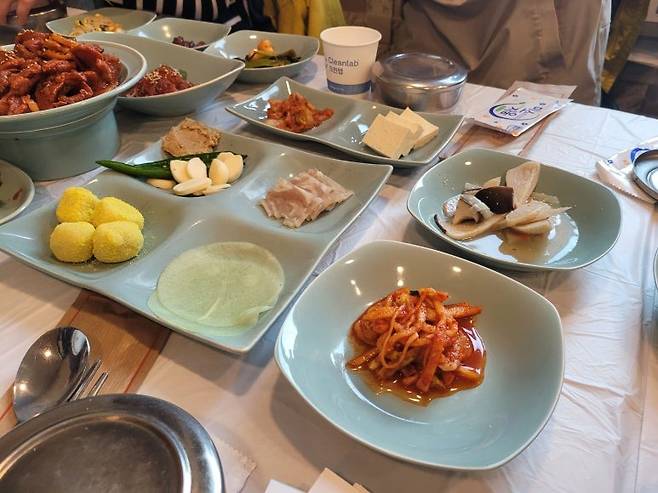 상차림 준비란게 이것이었구나. 손님들 착석하면 세팅하기 힘드니 기본적인 찬들은 미리 차려놨다.