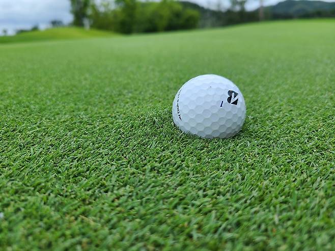 그린 표면 상태는 매우 좋았고 손상되어 있는 부분도 거의 없습니다. 잔디도 매우 촘촘하지만 이날 오전 많은 비가 내렸다고 하네요. 실제로, 파3 피칭 웨지로 한 샷이 위 사진처럼 그린에 박히기도 했네요. 참고로, 그린 잔디는 크리핑 벤트그라스 (creeping bent grass)입니다.