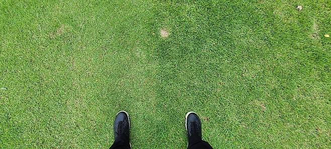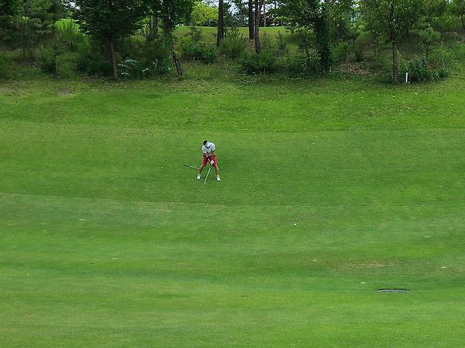 관리 상태가 돋보이는 중지 페어웨이입니다. 중지답게 잔디 길이도 적당하게 관리되어서 공이 잘 올라서 있습니다. 디봇 자국도 잘 메워져 있네요.