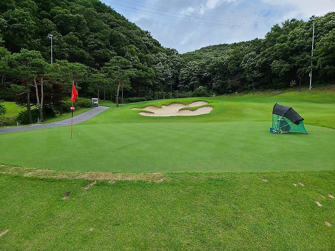 이날 레이크 5번 홀만 유일하게 임시 그린 사용. 매우 작고 평평한 그린으로 오히려 난이도 상승했다는! 본 그린은 벙커 위에 있습니다.