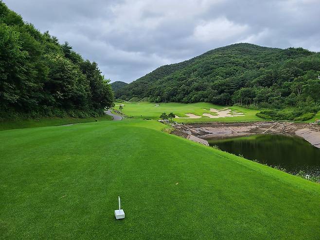 힐 코스 5번 홀, 100미터가량 떨어지는 드라이버 샷. 장타자들은 막창 및 해저드 주위.. 그러나 원온도 노릴만하겠네요.