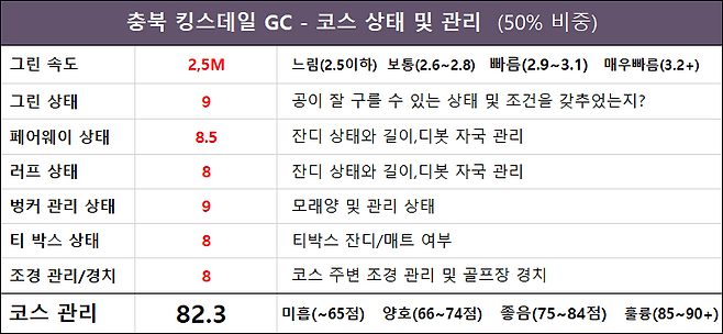 샷의 가치와 기억성, 코스 디자인과 경치, 조경, 시설물 등 어디 한 곳 빠지는 게 없는 18홀 대중 골프장입니다. 개인적으로, 그린 속도만 조금 올라온다면 나름 가성비까지 갖춘 코스라고 생각합니다. 5월에 KLPGA 교촌 레이디스 오픈도 호스팅 한 코스로 중/상급 골퍼들에게 아주 재밌는 트랙입니다. 단, 장타분들은 블루/블랙 티에서 승부를 보시는 게 킹스데일의 진정한 가치는 느낄 수 있을듯합니다.