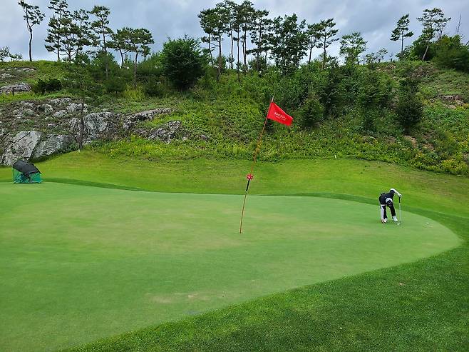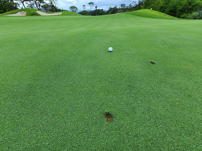 그린이 말라죽지 않도록 잔디를 약간 길게 관리한 덕분에 실제 그린 속도는 2.3~2.4M 정도로 느껴집니다.