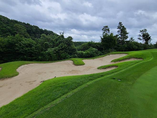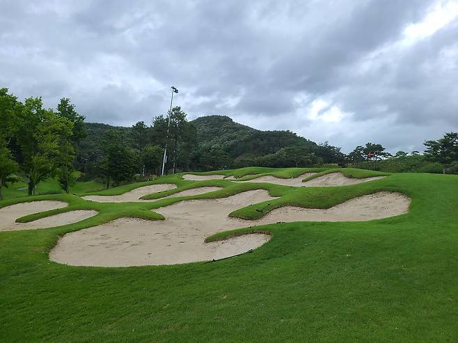 멋으로만 있는 벙커들은 절대 아닙니다. 모래도 매우 곱고 부드러워서 과감한 스윙이 요구되며, 벙커 턱도 높은 편입니다. 크기도 크지만, 그린 앞에 많이 몰려있어서 한번 빠지면 계속 빠질 수 있는 위협적인 설계입니다. 피하는 게 상책이며, 오르막 그린에 쏘는 세컨드 샷이면 한 클럽 더 잡고 그린 앞 벙커들을 무조건 넘고 봐야 합니다.