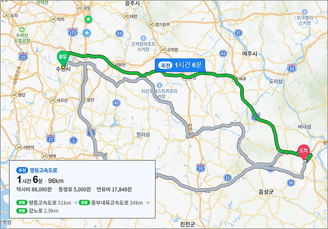 ▶ 이동 거리 / 접근성: 7점 (수원시청역 >> 충북 킹스데일 GC)