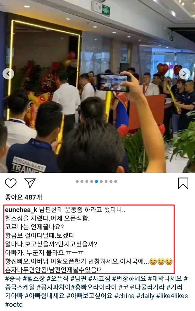 해당 게시물에서 성은채는 중국에서 남편이 새로 시작한 헬스장 사업의 오픈식 영상과 함께 "남편한테 운동 좀 하라고 했더니... 헬스장을 차렸다. 어제 오픈식함"이라는 글을 게재했습니다. 이어 "코로나는 언제끝나요? 황금보 걸어다닐때 보겠다. 얼마나 보고싶을까? 만지고 싶을까? 아빠가 누군지 몰라요"라며 "황진빠오. 아버님 이왕오픈한 거 번창하세요. 이 시국에"라고 애정을 드러냈지요.