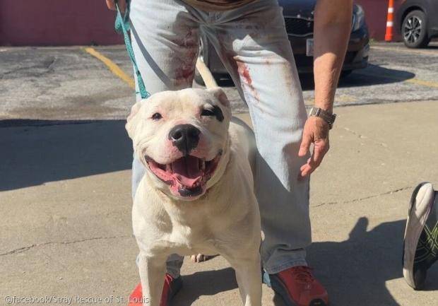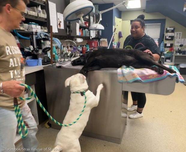 이 게시물을 본 동물구조단체 '세인트루이스 유기견 구조대(Stray Rescue of St. Louis, SRSL)'가 즉시 현장으로 출동했습니다. 도착해보니 검은색 강아지는 도로 가장자리에 누워있었고, 그 옆에서 핏불이 걱정스러운 눈빛으로 친구를 지키고 있었다고 합니다.