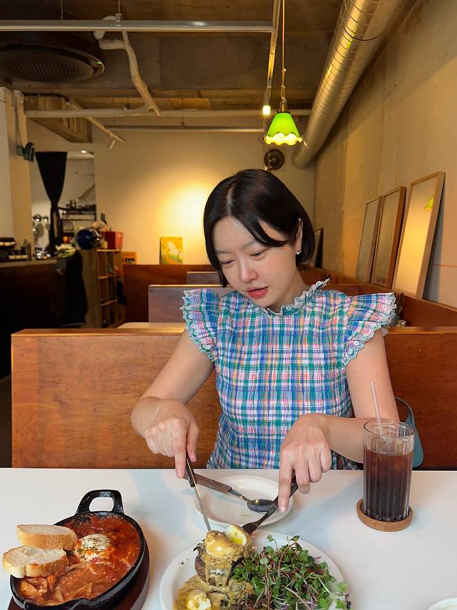 체크 패턴 러플 블라우스로 빈티지 매력을 발산하고 있다. 블루와 그린이 믹스된 체크 무늬의 민소매 블라우스는 어깨 라인의 러플 디테일로 로맨틱함을 더했다. 카페 분위기와 어우러진 자연스러운 스타일링으로 일상 속 소소한 멋을 표현하고 있다.