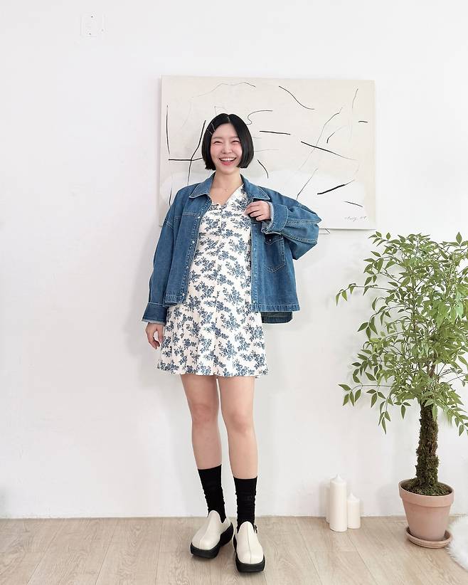레이디제인이 블루 플로럴 패턴 원피스에 데님 재킷을 레이어드한 스타일링을 연출하고 있다. 화이트 베이스에 블루 꽃무늬가 돋보이는 미니 원피스는 여성스러운 매력을 강조하며, 오버사이즈 데님 재킷으로 캐주얼함을 더했다. 블랙 삭스와 화이트 로퍼의 조합은 모던한 포인트를 제공하며, 전체적으로 편안하면서도 세련된 룩을 완성하고 있다.