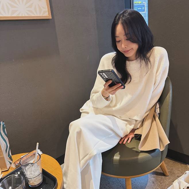 두 번째 사진에서는 화이트 니트와 와이드 팬츠를 매치해 깔끔하면서도 우아한 데일리룩을 완성했다. 니트의 부드러운 질감과 팬츠의 여유로운 실루엣이 조화를 이루며 편안함과 세련미를 동시에 담아냈다. 베이지 코트를 소품으로 활용해 전체적으로 따뜻한 톤을 더하며 고급스러운 무드를 자아냈다.