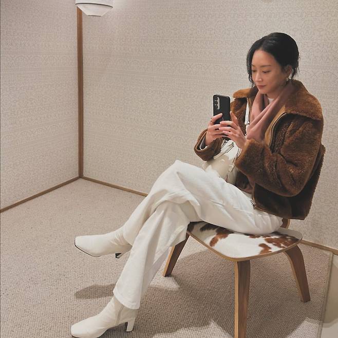 클래식한 겨울 스타일링을 보여주었다. 브라운 퍼 재킷과 화이트 팬츠를 매치해 따뜻하면서도 세련된 분위기를 연출했으며, 스카프를 활용해 포인트를 더했다. 여기에 화이트 앵클부츠를 신어 전체적으로 통일감을 주면서도 우아함을 강조했다.