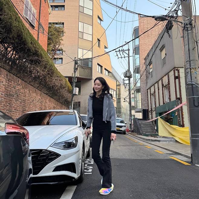 세 번째 사진에서 연민지는 모던한 스트릿 패션을 선보였다. 블랙 이너와 부츠컷 팬츠를 기본으로, 그레이 후드 재킷을 걸쳐 캐주얼하면서도 도시적인 스타일을 완성했다. 특히, 발끝에 포인트를 준 컬러풀한 운동화가 룩에 활기를 더하며 개성을 강조했다.