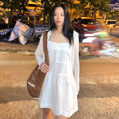 최근 공개된 사진 속 혜리는 상반된 매력을 가진 두 가지 룩을 선보였다. 첫 번째는 분위기가 180도 달랐다. 소녀 같은 화이트 미니 원피스에 부드러운 니트 가디건을 걸치고, 라탄 숄더백으로 포인트를 준 청순룩. 밤거리의 은은한 조명과 어우러져, 한 장의 로맨스 영화 속 주인공처럼 보였다.