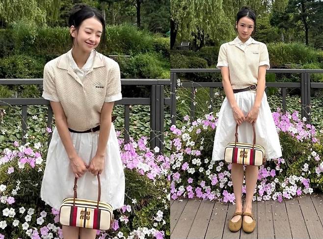 이번 착장은 베이지 계열의 니트 골프 티셔츠에 화이트 플레어 스커트를 매치해 단아하면서도 청순한 무드를 극대화했습니다.