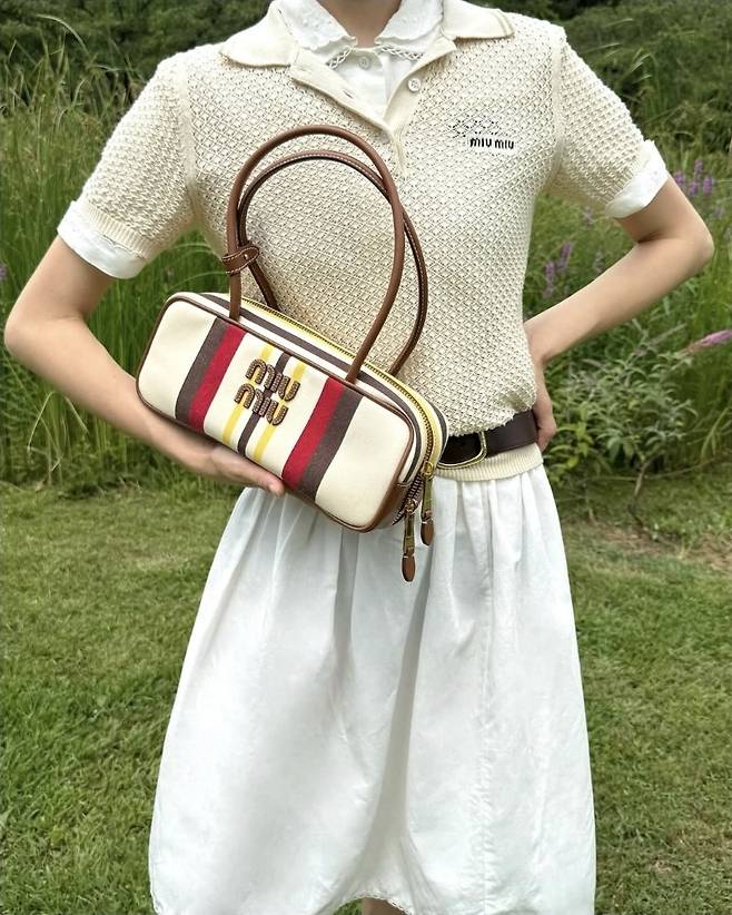 여기에 클래식한 브라운 벨트로 허리를 슬림하게 잡아주며 비율을 살렸고, 아이보리 톤과 버건디 스트라이프가 포인트인 톱핸들 명품백으로 은근한 럭셔리 포인트를 더했습니다.