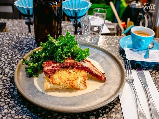 프라우드 메리는 현지에서 브런치로도 정평이 난 곳이다. 인기 메뉴는 베이컨과 해시브라운. 일반적인 바삭한 베이컨이 아니라, 이탈리아식 판체타처럼 도톰하고 짭조름한 베이컨과 감자를 큼직하게 썰어 강한 불에 구운 해시브라운의 질감이 인상적이다. 브런치와 함께 주문한 커피는 과테말라 산타 펠리사 농장의 스타마야 내추럴 싱글오리진 에스프레소. 촉촉한 베이컨과 질감이 살아 있는 해시브라운 사이로 스며드는 에스프레소의 향미가 질 좋은 스파클링 와인처럼 생생했다.