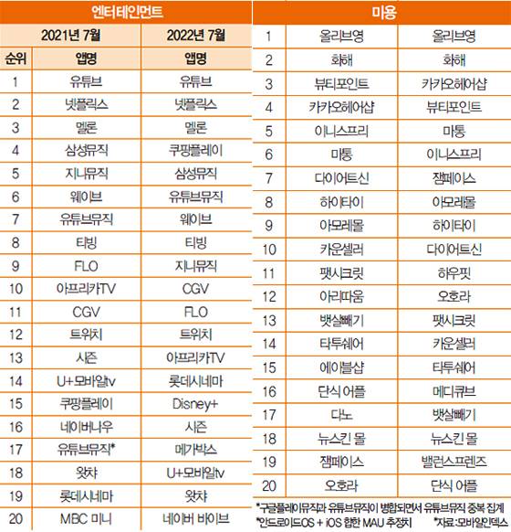 음원 스트리밍 서비스 중에서는 유튜브뮤직의 약진이 눈에 띈다. 유튜브뮤직 MAU는 지난해 7월 382만명에서 1년 새 457만명으로 늘었다. 전체 순위는 지난해보다 한 계단 상승한 6위고, 음원 스트리밍 서비스 중에서는 2위다. 여전히 멜론이 음원 스트리밍 서비스 중 1위(전체 3위)를 유지하고 있지만, 멜론은 지난해보다 MAU 수치 자체는 100만명 이상 빠졌다. 지니뮤직, 플로 등도 비슷하다.