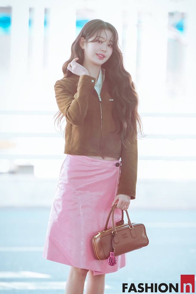 이날 장원영은 긴 웨이브 헤어 스타일에 핑크 스커트와 브라운 컬러의 스웨이드 재킷을 입고 러블리하면서도 귀여운 출국룩을 선보였다.