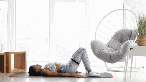 매트에 누워 준비 자세를 만듭니다. 다리 사이에 밴드를 착용하고, 무릎을 당겨 세우며 발바닥은 바닥에 고정합니다. 엉덩이를 들어 올려 브릿지 자세를 만듭니다. 이때 다리를 벌렸다가 다시 오므리는 동작을 추가합니다.