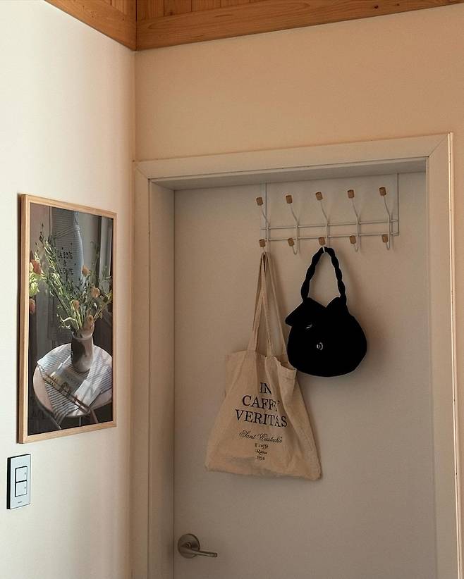 드레스룸에 들어가는 문에는 도어훅 행거를 걸어두었어요. 자주 들고 다니는 가방이나 모자를 걸어주면, 조금이나마 준비하는 시간을 줄여줍니다. 그리고 애매하게 걸어둘 공간이 없다면 도어훅 행거가 좋은 대안이 됩니다.