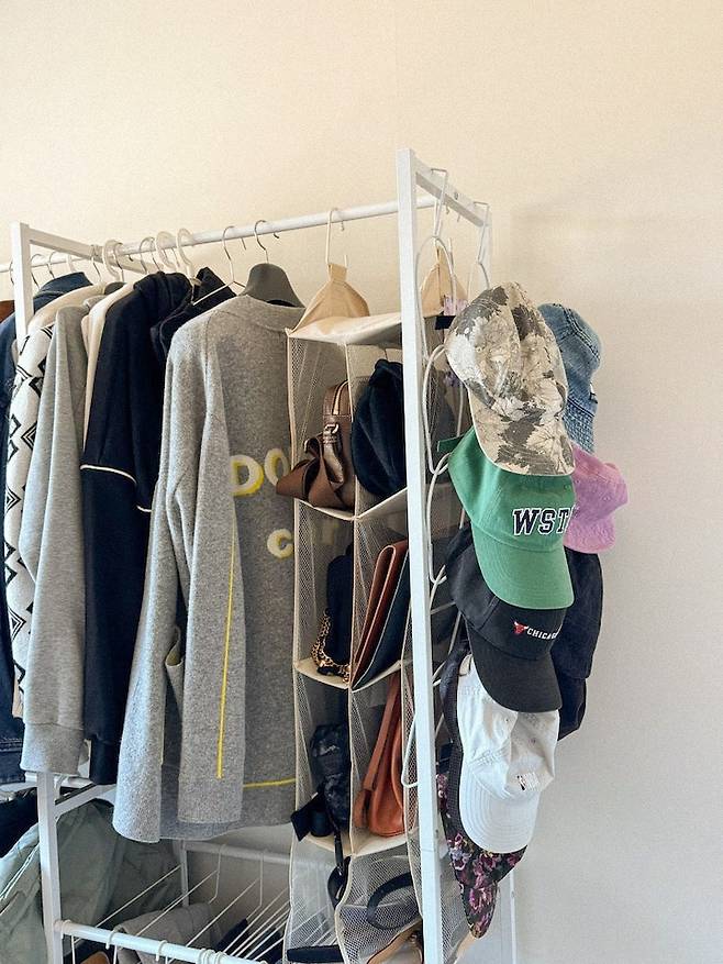 모자와 가방은 항상 둘 곳이 마땅치 않았었어요. 이 제품을 알기 전까지는 말이죠. 요즘 산 아이템 중에 가장 실용적인 거 같습니다. 가방도 어딘가에 굴러다니지 않고 제 위치에 있는 걸 보면 뿌듯하고, 모자도 마찬가지로 틈새에 저렇게 많은 모자들을 걸어둘 수 있어서 정말 좋아요.