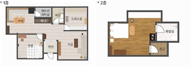 오늘의집 3D로 간단하게 해 본 도면입니다. 집이 크지는 않고, 특히 거실이 좁은 편입니다. 하지만 주방과 거실이 분리되어 독립적인 공간으로 나눌 수 있고 2층도 분리되어 쓸 수 있어서, 손님들이 와서 쓰기에 아주 적절한 구조입니다.