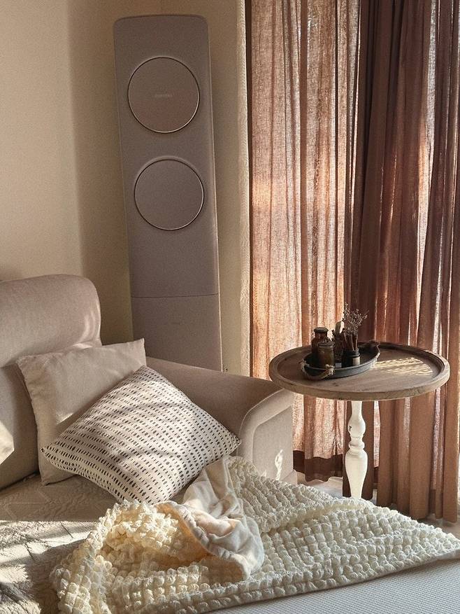 이것이 바로 톤연일체. 크림색의 소파와 쿠션, 내추럴한 브라운 린넨 커튼과 애쉬 우드 빈티지 사이드 테이블의 조합입니다. 이러한 요소들이 집의 분위기를 더욱 살려주는 것 같아요.