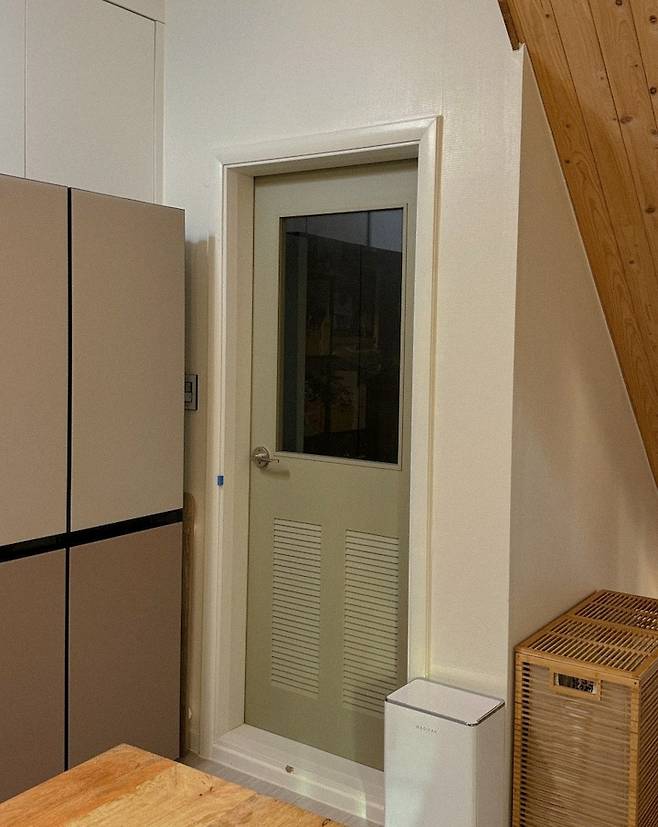 처음 이사 왔을 때 문은 주얼리가 박혀있는 촌스러운 문이었습니다. 우리 집의 인테리어와 문의 디자인이 어울리지 않았기 때문에 집에 있는 모든 문을 교체하였습니다. 교체한 문들이 화이트의 심플한 문이었는데, 이 팬트리로 향하는 문만큼은 색다르게 하고 싶어서 창이 달려있는 올리브색 문으로 선택하게 되었어요.