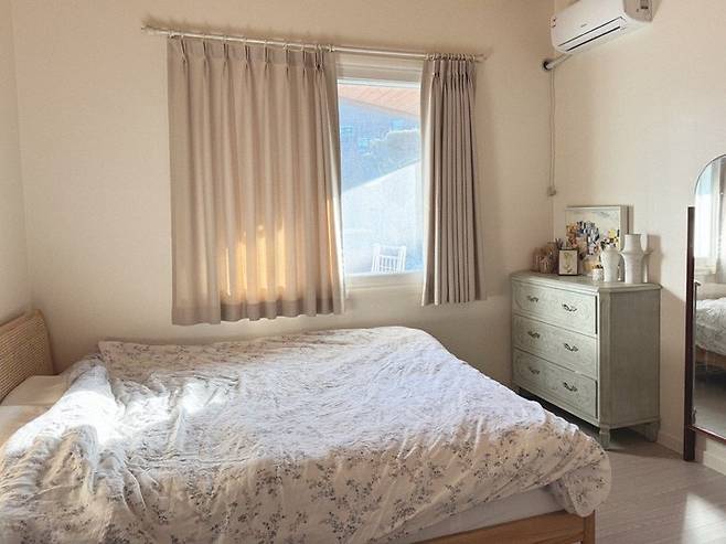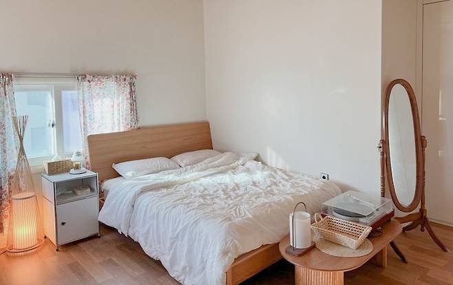 잠을 자는 침대만큼은 무게감이 느껴지지 않고 볼드하지 않았으면 좋겠다고 생각했습니다. 그래서 편안하고 안락함을 느끼게 해주는 내추럴한 라탄 침대를 선택했어요. 라지 킹사이즈인데, 방의 크기만 여유롭다면 라지 킹이 잘 때도 부대끼지 않아 편안해요.