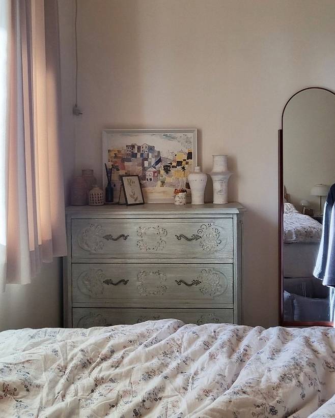 화장대나 서랍장 등 실제로 빈티지는 아니지만 빈티지의 느낌이 나는 에이징 작업이 된 가구들을 구매했습니다. 실제로 낡은 게 아니기 때문에 견고하고 깨끗하지만, 낡은 분위기를 자아내기 때문에 더욱 더 집이 매력적으로 보이는 거 같아요.