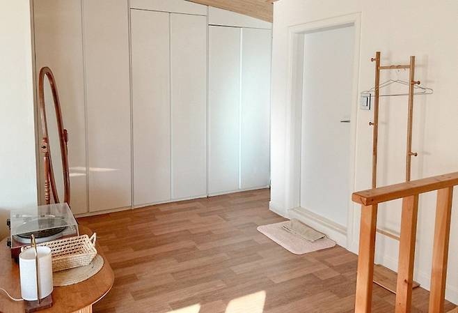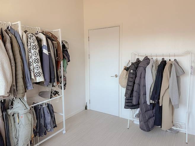 이곳의 방 크기는 그렇게 작지도 않고, 침실로 사용할 수 있는 만큼 큰 편이에요. 하지만 2인 가구는 방의 개수가 많이 필요하지는 않더라고요. 이곳이 남는 방이기도 했고, 붙박이장도 있기 때문에 옷방이 되었습니다. 하지만 넘쳐나는 옷들을 붙박이장이 다 해결해 주지 못해서 행거를 두 개씩이나 두게 되었답니다.
