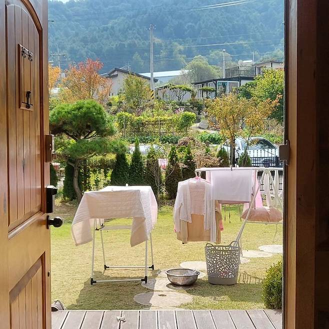 전원주택의 큰 장점 중에 하나는 바로 빨래라고 할 수 있을 거 같아요. 집 앞에 큰 마당이 있기 때문에 옷이든 이불이든 마음껏 펼쳐놓고 햇빛건조를 시킬 수 있죠. 햇빛에 건조하게 되면 자외선 살균이 되기 때문에 더욱 좋은 거 같아요. 햇빛이 좋은 날 이렇게 빨래를 너는 것이 귀찮지 않고 오히려 힐링이 됩니다.