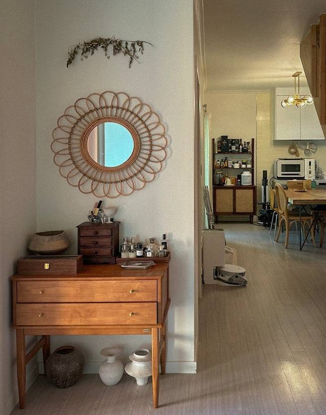 집이 전체적으로 우드가 많기 때문에 대부분의 가구, 소품들도 우드로 맞추어져 있어요. 그리고 우드와 잘 어울리는 빈티지 풍의 도자기나 화병도 덤입니다.