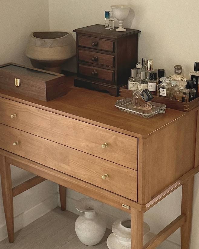 화장대 또한 빈티지는 아닌데 빈티지 느낌이 나는 에이징 된 가구입니다. 애쉬 컬러의 우드와 곡선의 거울이 정말 매력적입니다. 액세서리 함은 유럽 신혼여행 가서 구매했는데 역시나 화장대와 잘 어울려요.