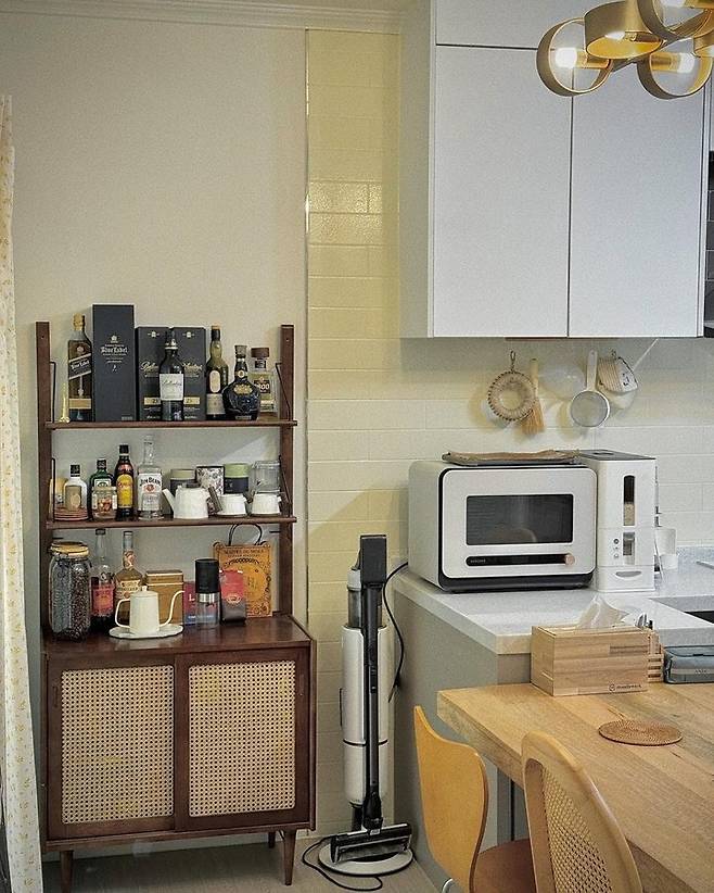 라탄 주방 수납장은 홈카페로 쓰기에도 제격이고, 주방 장식장으로 쓰기에도 정말 멋진 수납장이에요. 빈티지한 무드까지 더해져 집을 더욱 매력 있게 만들어줍니다. 이곳에는 커피용품들과 차 종류와 술 등이 장식되어 있어요. 보기만 해도 흐뭇해지고 주방을 더욱 더 완벽하게 만들어주는 것 같아요.