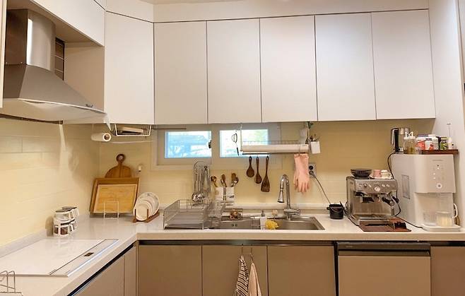 처음 집에 들어왔을 때 주방의 갈색 타일이 눈에 계속 거슬렸어요. 전체적으로 집이 밝고 환한 편인데, 주방만 어두운 타일이어서 튀는 느낌이었거든요. 그래서 주방을 타일전용 페인트로 칠해주었습니다. 그래서 어두워 보였던 주방이 환하게 바뀌었어요. 타일페인트는 잘 지워지지도 않고 타일같이 미끄러운 면에도 잘 붙어서 지금까지도 정말 깨끗하게 유지되고 있어요.