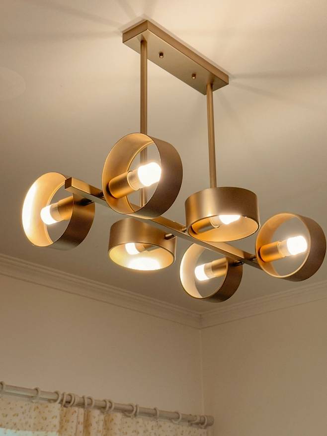 평범하지 않고 주방과 잘 어우러지는 걸 찾다가 우연히 눈에 들어왔던 조명입니다. 모양은 모던한데 컬러는 빈티지해서 더욱 매력 있는 조명이에요. 게다가 원형의 장식이 360도 회전하기 때문에 원하는 모양을 낼 수 있어요.