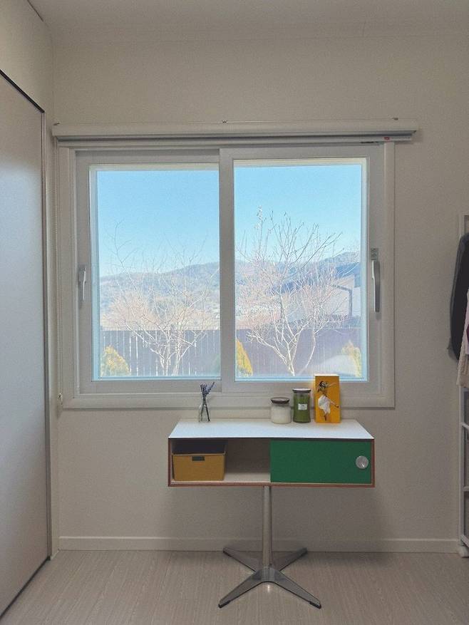 가끔 노트북으로 작업을 해야 할 때만 주로 가서 하는 책상 자리입니다. 창밖의 먼 산도 내다보면서 작업하면 눈에 피로도 덜하고, 스트레스도 덜 받더라고요. 책상과 의자는 자연과 잘 어우러지는 내추럴한 우드들의 조합이라 창밖의 풍경이랑도 잘 어울립니다.
