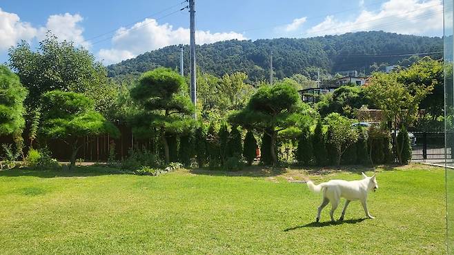 진돗개 두 마리가 마음껏 뛰어놀 수 있는 잔디밭. 이렇게 초록빛의 빛나는 잔디를 보고 있으면 스트레스와 걱정이 누그러집니다.
