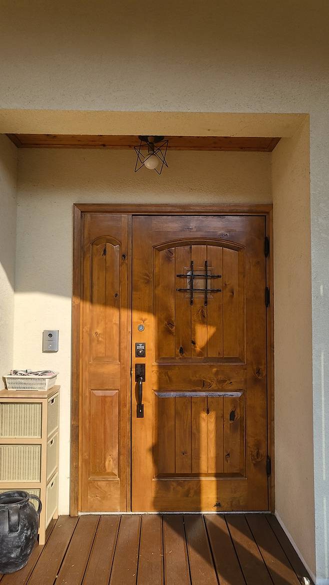 우리 집의 가장 매력 중에 하나인 현관문입니다. 원목의 느낌이 아주 유럽의 빈티지한 느낌을 내고 있어요. 현관문 바깥에는 야외에서 많이 사용하는 정원용품과 운동용품 등이 들어있습니다.