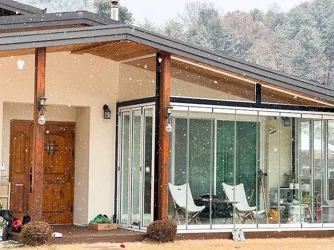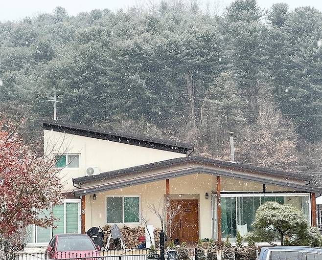 얼마 전 눈이 왔을 때 찍은 사진이에요. 전원주택은 계절마다 다른 풍경의 모습을 볼 수 있다는 점이 가장 매력적인 거 같아요. 봄의 연둣빛 새싹이나, 여름의 푸릇푸릇함, 가을의 단풍, 겨울의 눈꽃을 보면 이만한 예술작품도 없는 거 같아요.