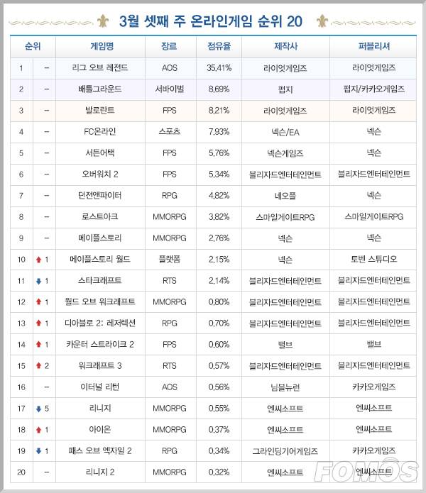 이 외에 순위 변동은 하락 폭에 따라 나타났다. '리니지'의 일 이용시간은 36.8%, '패스 오브 엑자일 2'의 일 이용시간도 19.5% 각각 감소했다.