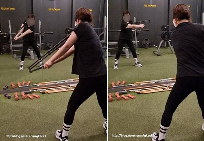 오른쪽에 견착 후 풀스윙 연습으로