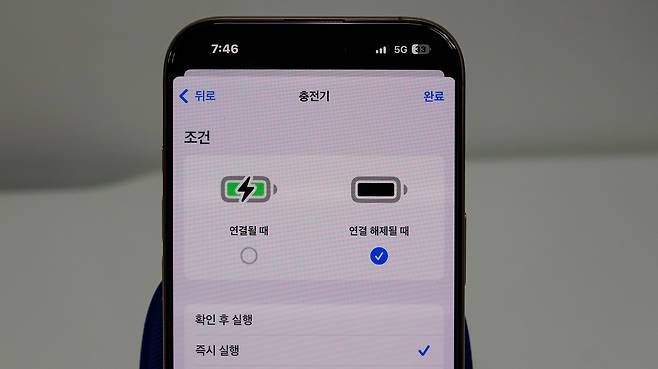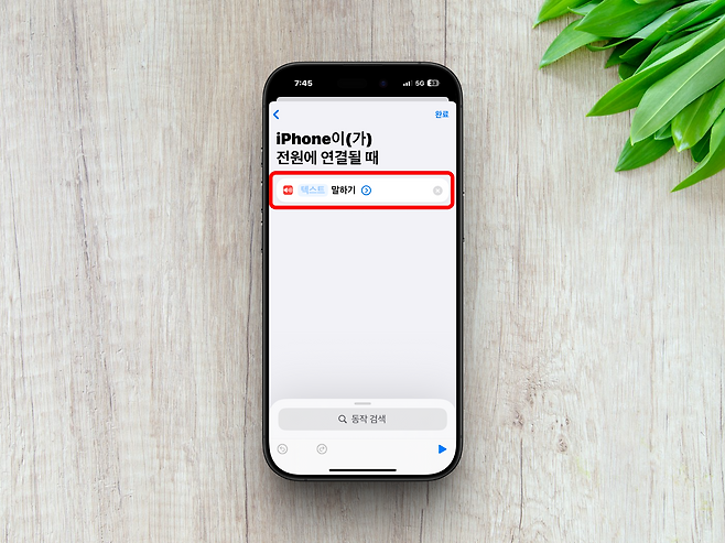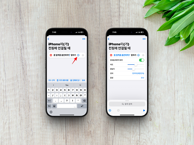 설정이 다 됐으면, 오른쪽 위에 있는 '완료' 버튼을 눌러주세요. 이제부터는 충전기만 꽂아도 아이폰이 여러분이 적어둔 문장을 진짜 말로 읽어줍니다.