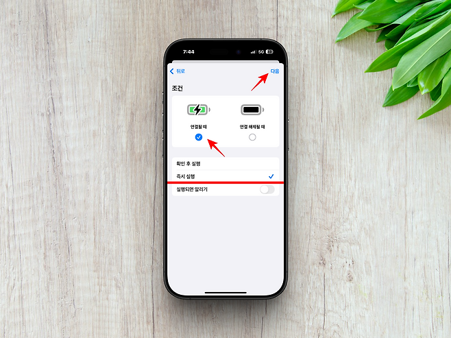 다음 화면에서 '충전기 연결 시'가 선택되어 있는지 확인해 주시고, 가장 아래쪽에 있는 '즉시 실행'도 켜주세요. 이게 꺼져 있으면 아이폰이 말을 하지 않습니다. 다음 메뉴를 선택해주세요.