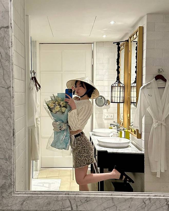 강지영이 베트남에서 포착한 이국적인 룩이 화제를 모으고 있다. 인스타그램에 올라온 사진 속 강지영은 전통 베트남 모자인 논라를 쓴 채 거울 셀카를 남기며, 꽃다발과 함께한 유쾌한 미소로 이목을 사로잡았다. 샤워부스가 보이는 깔끔한 호텔 욕실에서 찍은 이 사진은 강지영 특유의 여유롭고도 감각적인 패션 센스를 엿볼 수 있는 장면이다.