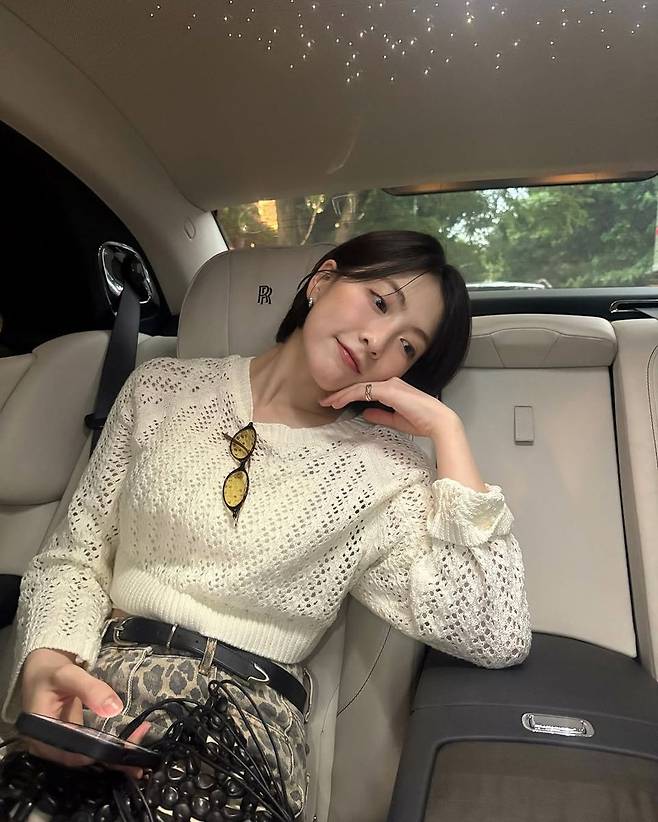 하의는 강렬한 인상의 레오파드 미니스커트다. 허리 스트링과 짧은 기장감이 만나 경쾌한 무드를 연출하며, 크롭 니트와의 상하 밸런스를 완벽하게 맞췄다. 스타일리시한 야성미와 동시에 여리여리한 상의 디테일이 상반된 매력을 만들어내 시선을 끈다.