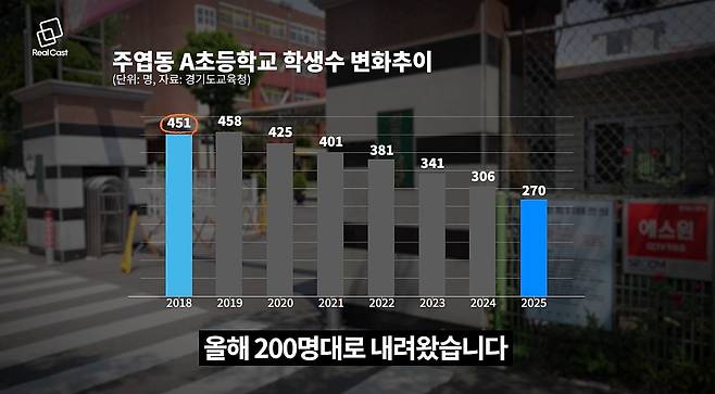일산 주엽동에 위치한 한 초등학교는 불과 6~7년 전만 해도 학생 수가 450명에 달했으나, 현재는 200명대로 감소하였습니다.